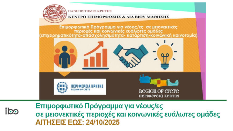 Ενημέρωση Επιμορφωτικό Πρόγραμμα για νέους/ες σε μειονεκτικές περιοχές και κοινωνικές ευάλωτες ομάδες (επιχειρηματικότητα-απασχολησιμότητα- κατάρτιση-κοινωνική καινοτομία) – Αιτήσεις έως 24/10/2025 15/10/2025