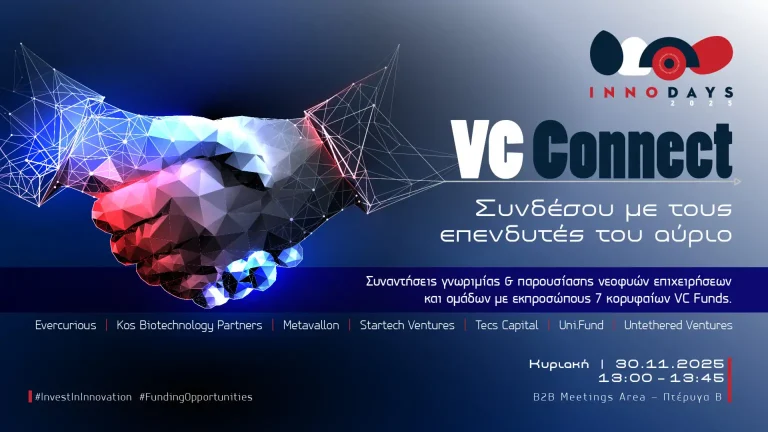 Ενημέρωση VC Connect: Συναντήσεις παρουσίασης επιχειρηματικών ιδεών νεοφυών επιχειρήσεων & ομάδων με εκπροσώπους κορυφαίων VC Funds (Κεφάλαια Επιχειρηματικών Συμμετοχών) – InnoDays 2025 17/11/2025