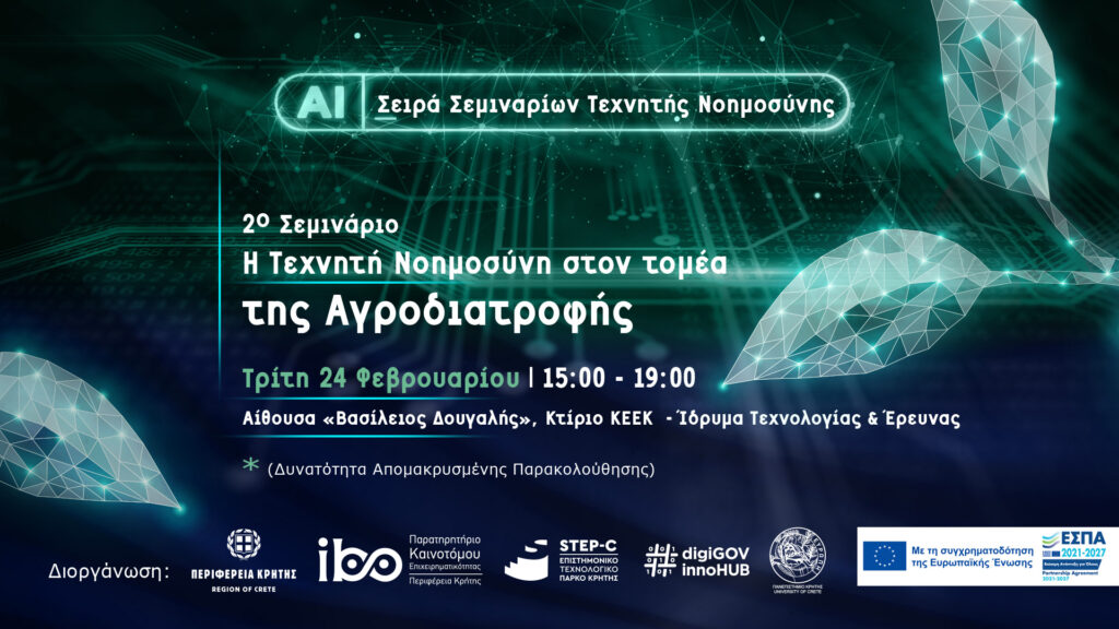 - Τεχνολογίες Τεχνητής Νοημοσύνης – Εφαρμογές στον Τομέα της Αγροδιατροφής (Τρίτη, 24 Φεβρουαρίου 2026, 15:00 – 19:00)