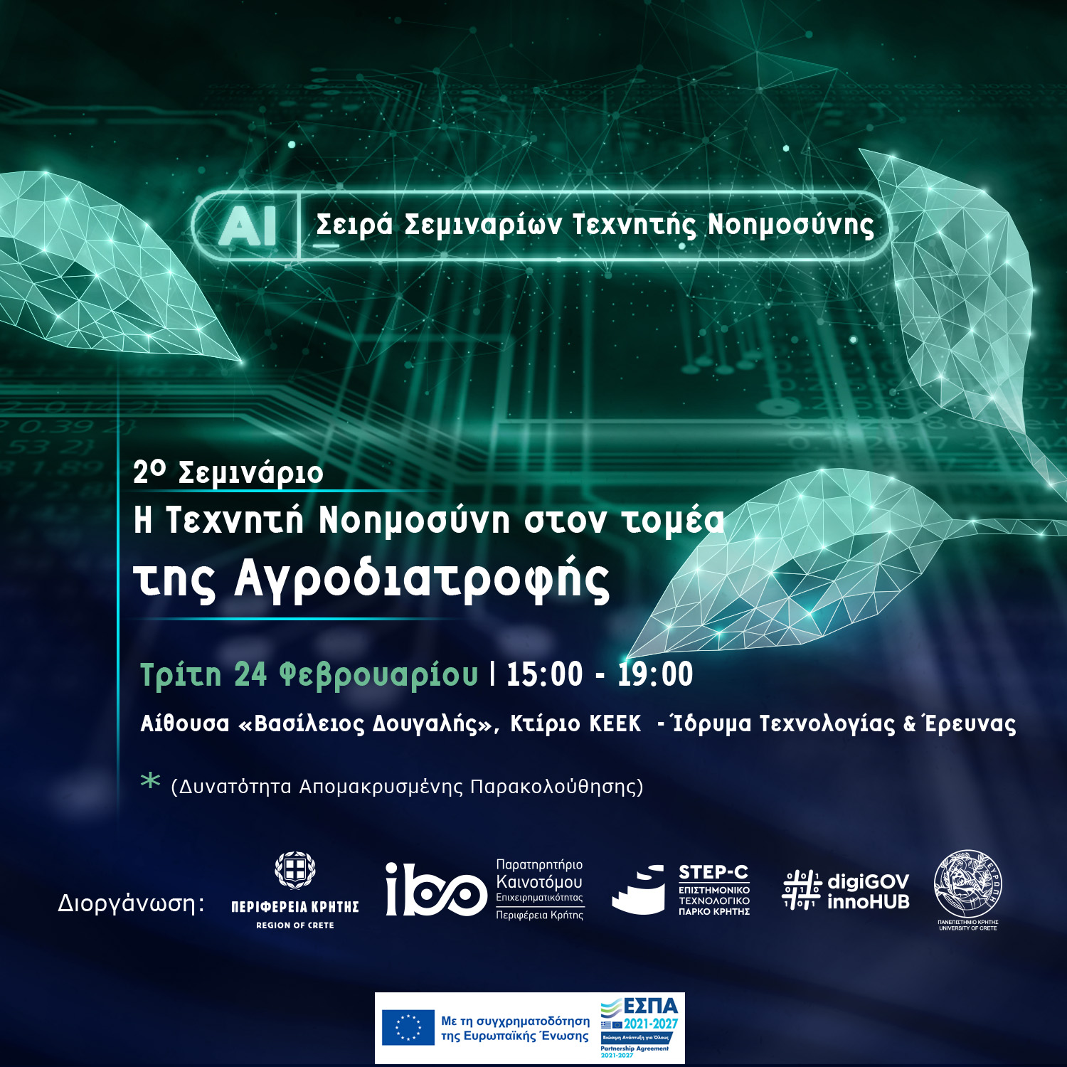 - Τεχνολογίες Τεχνητής Νοημοσύνης – Εφαρμογές στον Τομέα της Αγροδιατροφής (Τρίτη, 24 Φεβρουαρίου 2026, 15:00 – 19:00)