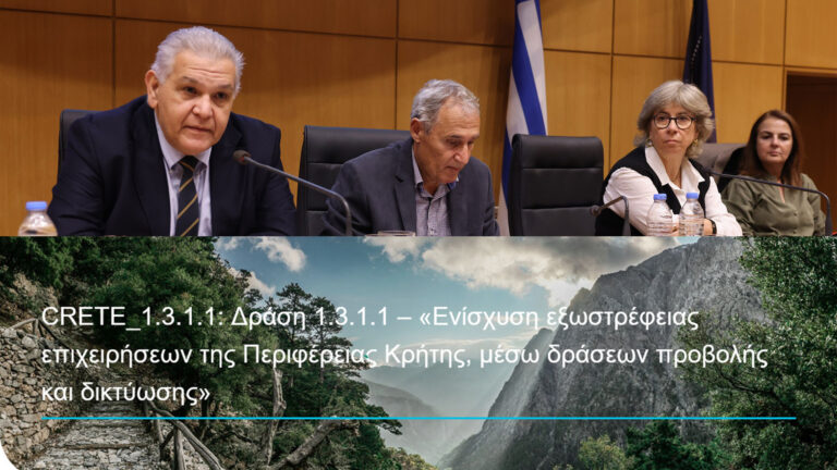 Ενημέρωση Ενίσχυση εξωστρέφειας και καινοτομίας | Παρουσιάστηκε η νέα δράση: Ενίσχυση εξωστρέφειας επιχειρήσεων της Περιφέρειας Κρήτης, μέσω δράσεων προβολής και δικτύωσης στο πλαίσιο του Προγράμματος «ΚΡΗΤΗ» 2021-2027» 21/11/2025