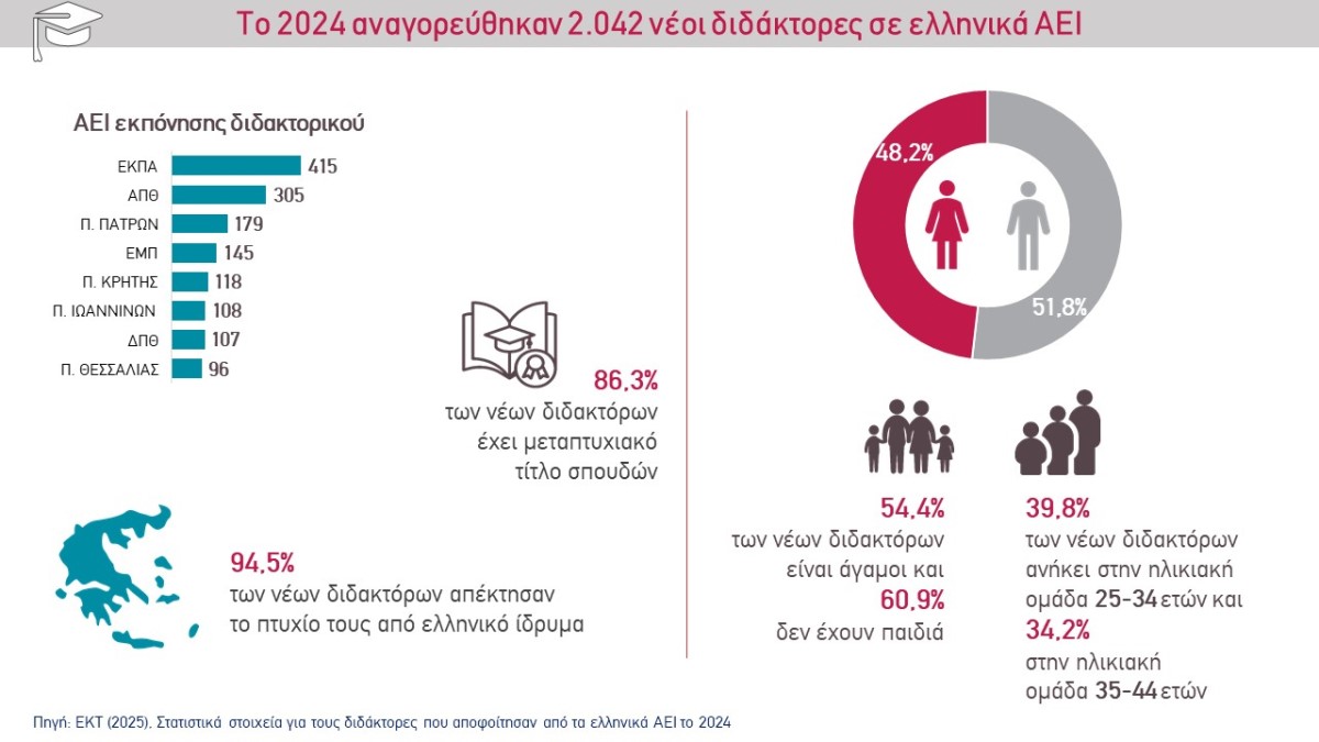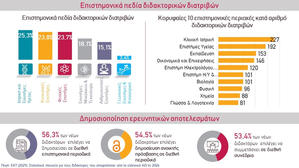 Η ετήσια απογραφική έρευνα του Εθνικού Κέντρου Τεκμηρίωσης καταγράφει το σύνολο των νέων διδακτόρων που αναγορεύθηκαν από τα ελληνικά ΑΕΙ το 2024, αντλώντας δεδομένα από την κατάθεση διατριβών στο Εθνικό Αρχείο Διδακτορικών Διατριβών (ΕΑΔΔ).