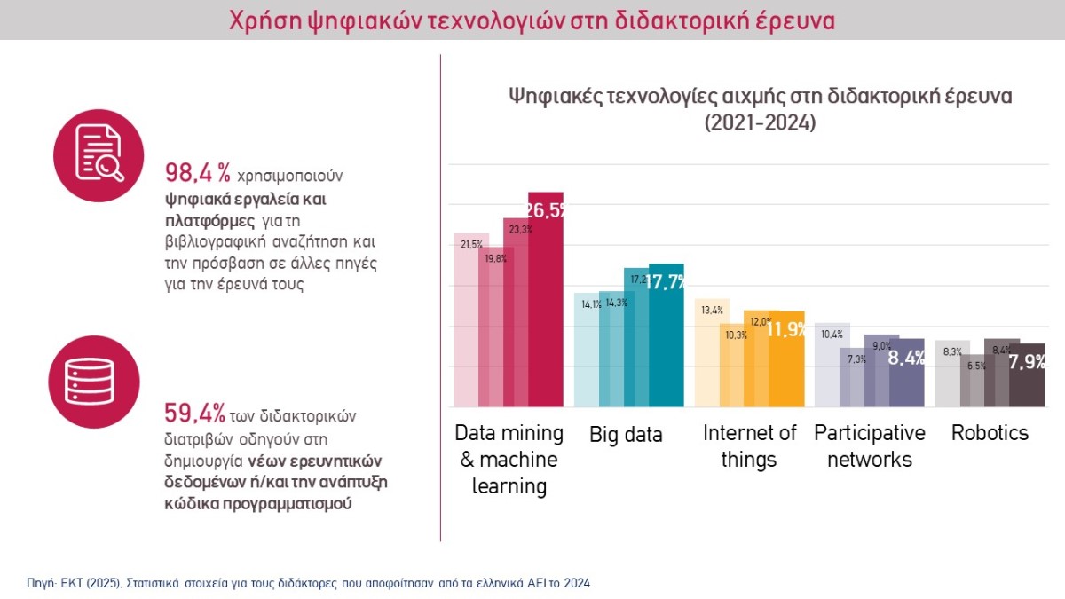 Για τις ανάγκες της διδακτορικής τους έρευνας, οι νέοι διδάκτορες αξιοποίησαν σύγχρονες ψηφιακές τεχνολογίες αιχμής. Συγκεκριμένα, 26,5 % χρησιμοποίησαν ή ανέπτυξαν μεθόδους εξόρυξης γνώσης και μηχανικής μάθησης (data mining & machine learning), 17,7 % αξιοποίησαν δεδομένα μεγάλης κλίμακας (Big Data), 11,9 % ασχολήθηκαν με το Internet of Things, 8,4 % με συμμετοχικά δίκτυα και 7,9 % με τη ρομποτική. Η πλειονότητα (75,5 %) βασίστηκε σε βάσεις δεδομένων διαχειρίσιμες με συμβατικά εργαλεία (π.χ. Excel, SPSS). Την περίοδο 2021–2024, οι εφαρμογές τεχνητής νοημοσύνης και τα Big Data σημείωσαν αύξηση, ενώ οι υπόλοιπες τεχνολογίες διατήρησαν σταθερή χρήση.