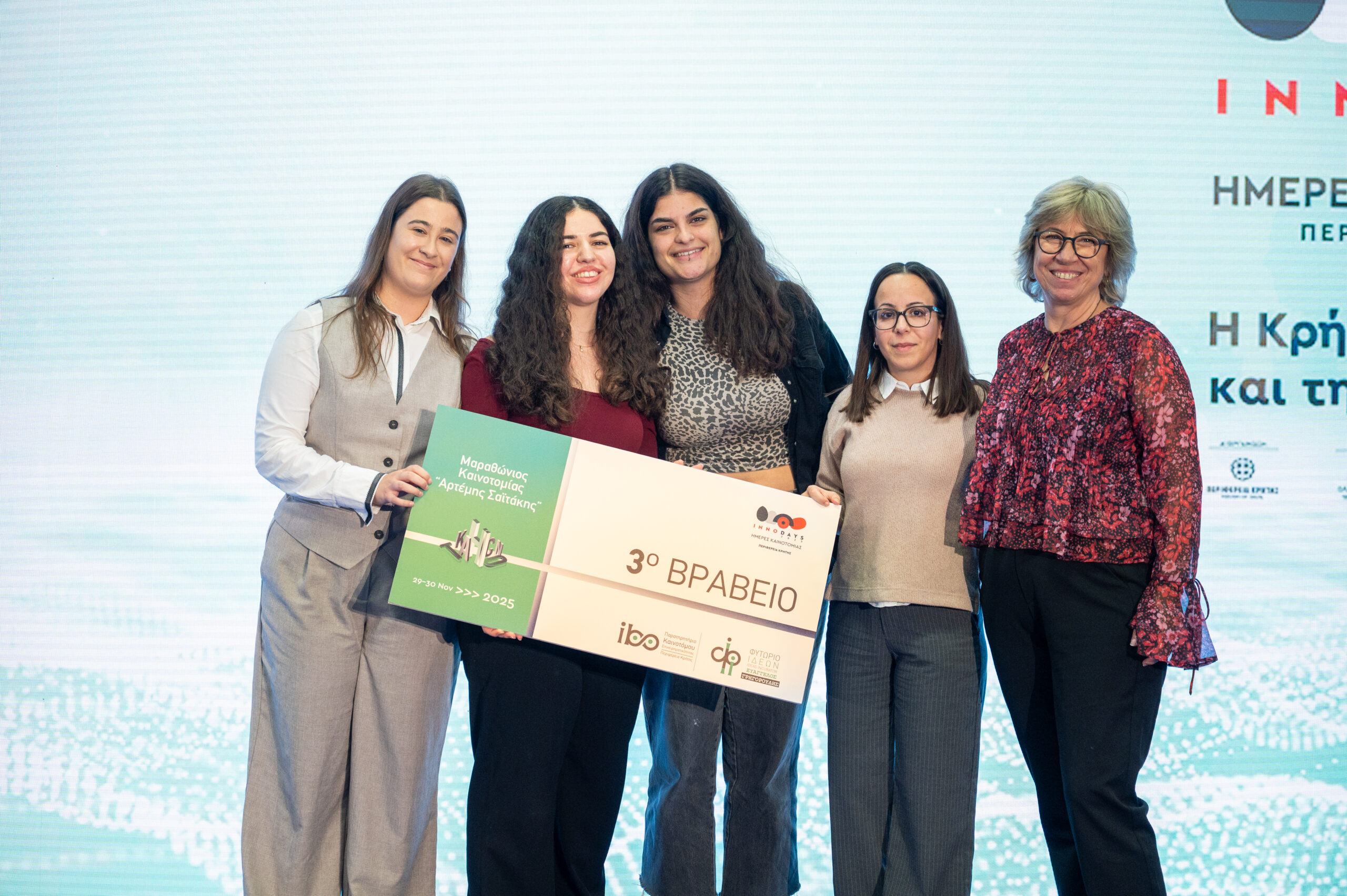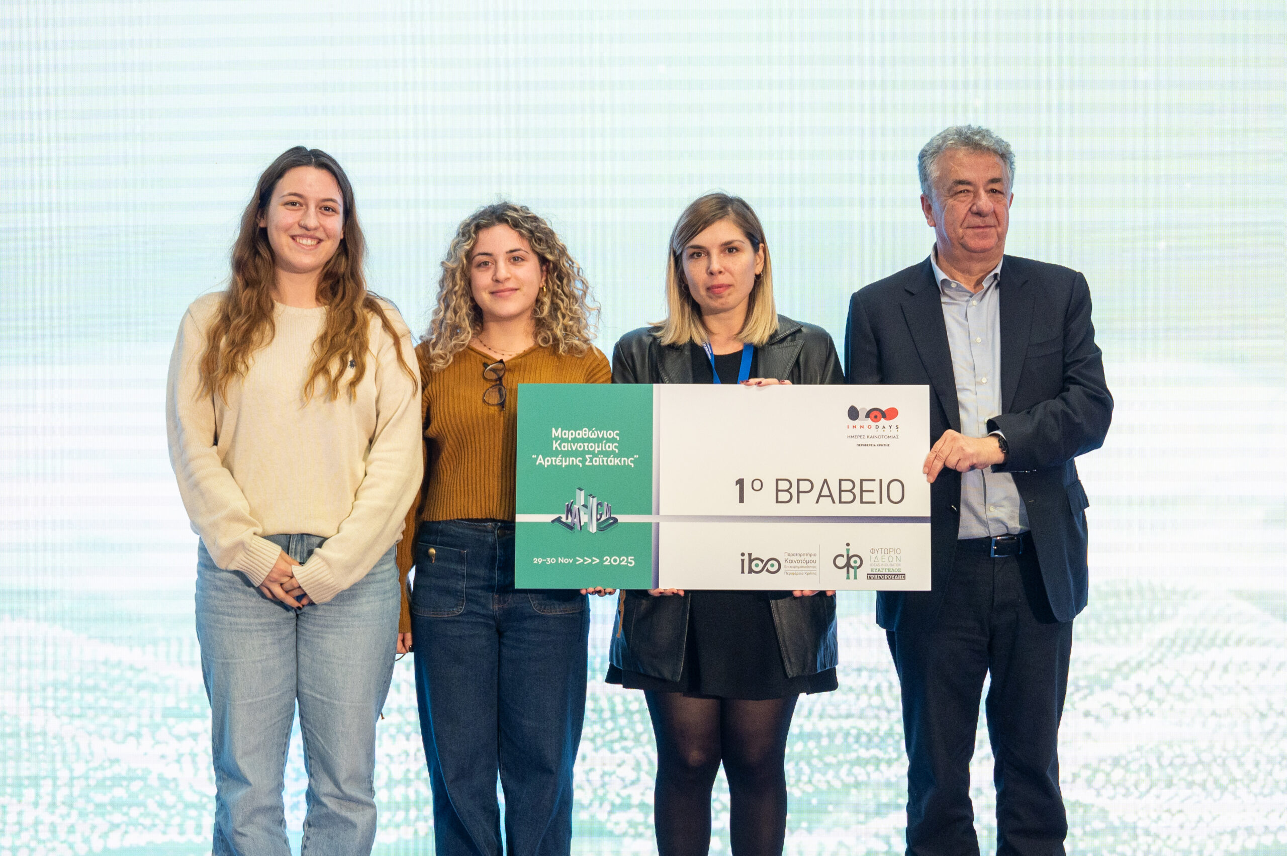 Το 1ο Βραβείο απονεμήθηκε από τον Περιφερειάρχη Κρήτης κ. Σταύρο Αρναουτάκη στην Ομάδα 6 των φοιτητών/ ερευνητών του Τμήματος Χημείας του Πανεπιστημίου Κρήτης, κ.κ. Αγγελική Γιαννούλη, Ντανιελίτα Ντάναϊ και Χριστίνη Φιωτάκη.