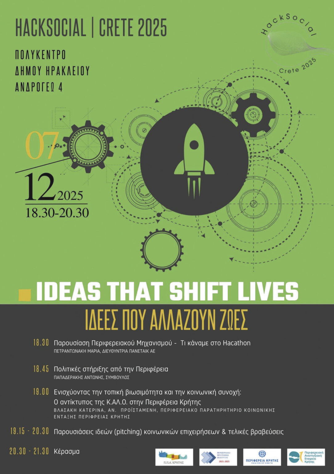 Η Περιφέρεια Κρήτης και η Π.ΑΝ.ΕΤΑΙ.Κ. Α.Ε, απευθύνουν ανοιχτό κάλεσμα στο ενδιαφερόμενο κοινό να παρευρεθεί στη δημόσια εκδήλωση που θα πραγματοποιηθεί την Κυριακή 07.12.2025, 18:30–20:30 στο Πολυκέντρο του Δήμου Ηρακλείου, Ανδρόγεω 4, αφιερωμένη στις πρωτοβουλίες κοινωνικής επιχειρηματικότητας και κοινωνικής καινοτομίας της Κρήτης. Στην εκδήλωση θα παρουσιαστούν τα αποτελέσματα της δουλειάς των 7 επιλεγμένων φορέων που συμμετείχαν στο εκπαιδευτικό πρόγραμμα του HackSocial Crete 2025, εξελίσσοντας την ιδέα τους σε μια καινοτόμα δράση υψηλού κοινωνικού αντίκτυπου, με στόχο τη βιώσιμη τοπική ανάπτυξη.