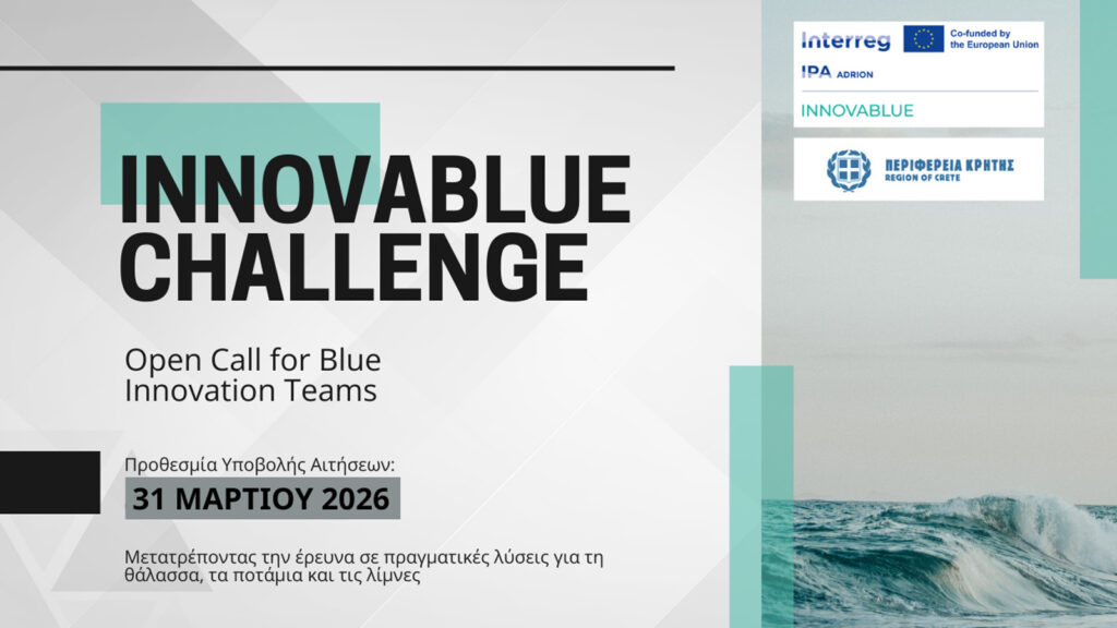 Στο πλαίσιο υλοποίησης του Ευρωπαϊκού έργου INNOVABLUE, έχει δημοσιευθεί η Ανοιχτή Πρόσκληση “INNOVABLUE Challenge – Blue Innovation Teams”, η οποία απευθύνεται σε ερευνητές, innovators, μηχανικούς, startups, developers και διεπιστημονικές ομάδες που αναπτύσσουν λύσεις για τη βιώσιμη αξιοποίηση θαλάσσιων, ποτάμιων και λιμναίων οικοσυστημάτων και για την ενίσχυση της γαλάζιας οικονομίας στην περιοχή ADRION.