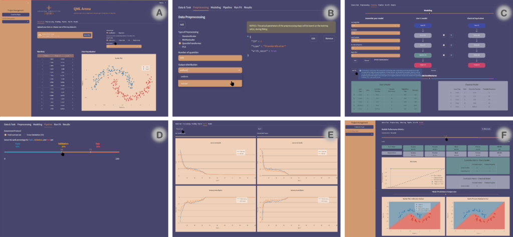 Η πλατφόρμα QML-Arena είναι ένα εύχρηστο, διαδραστικό περιβάλλον που μαθαίνει στους χρήστες πώς να χρησιμοποιούν τεχνικές μηχανικής μάθησης — τόσο τις συμβατικές όσο και τις νέες κβαντικές. Μέσα από εργαλεία για ανάλυση δεδομένων, σχεδιασμό μοντέλων και σύγκριση αποτελεσμάτων, οι χρήστες μπορούν να δοκιμάσουν πρακτικά παραδείγματα και να δουν πώς συμπεριφέρονται τα κλασικά και τα κβαντικά νευρωνικά δίκτυα