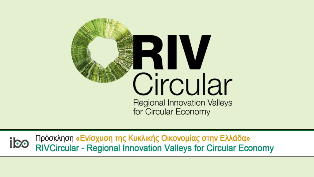 Η πρόσκληση «Ενίσχυση της Κυκλικής Οικονομίας στην Ελλάδα» υλοποιείται στο πλαίσιο του ευρωπαϊκού έργου RIVCircular – Regional Innovation Valleys for Circular Economy, το οποίο συγχρηματοδοτείται από την Ευρωπαϊκή Επιτροπή μέσω του προγράμματος Horizon Europe.