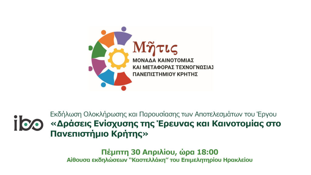 Ο Πρύτανης του Πανεπιστημίου Κρήτης Καθηγητής Γεώργιος Μ. Κοντάκης σας προσκαλεί στην εκδήλωση ολοκλήρωσης και παρουσίασης των αποτελεσμάτων του έργου: