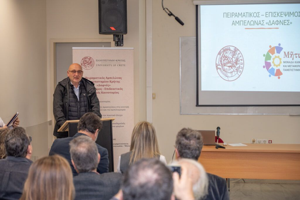 Πραγματοποιήθηκε την Παρασκευή 13 Φεβρουαρίου 2026 η Ημερίδα με θέμα «ΠΑΝΕΠΙΣΤΗΜΙΑ ΑΡΙΣΤΕΙΑΣ | Ανάπτυξη Κέντρων Καινοτομίας / Επιχειρηματικότητας – Ερευνητικές και Τεχνολογικές Καινοτομίες στον Αμπελοοινικό Τομέα», στο Τμήμα Χημείας του Πανεπιστημίου Κρήτης, η οποία επισφραγίστηκε με την υπογραφή Μνημονίου Συνεργασίας μεταξύ του Ιδρύματος και του Δικτύου Οινοποιών Κρήτης. Η εκδήλωση, που διοργανώθηκε από τη «Μήτις» Μονάδα Καινοτομίας και Μεταφοράς Τεχνογνωσίας του Πανεπιστημίου Κρήτης, ανέδειξε τον Πειραματικό Αμπελώνα «Δαφνές», ο οποίος αναπτύσσεται σε αγροτεμάχιο του κληροδοτήματος Μ. Μανασάκη, ως πρότυπη ερευνητική υποδομή και σημείο σύνδεσης της ακαδημαϊκής κοινότητας με την παραγωγή.